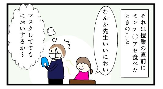 ミンテ〇アはこのころよく効いたので家で食べていましたが、授業の直前に職員室で食べた日のこと。